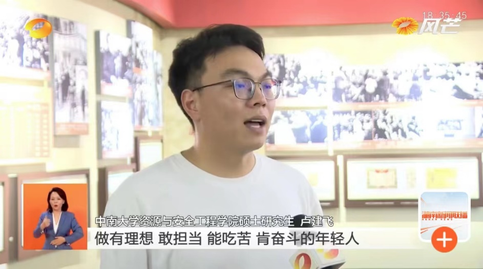 卢建飞在接受湖南卫视采访时说:作为新时代的我们,要树立远大的理想,做有理想、敢担当、能吃苦、肯奋斗的年轻人,用党的思想武装自己,青年强则中国强。
