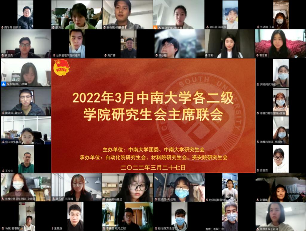 喜迎二十大、永远跟党走、奋进新征程,为加强二级学院研究生会思想政治建设,切实落实团委的指导精神,增强研究生会自我民主建设的力度,提高研究生会工作效率,2022年3月27日下午,yl6809永利二级学院研究生会线上主席联会顺利举行。会议由共青团yl6809永利委员会、yl6809永利研究生会主办,自动化学院研究生会、材料科学与工程学院研究生会、资源与安全工程学院研究生会承办,yl6809永利研究生会执行主席曾裕主持会议。