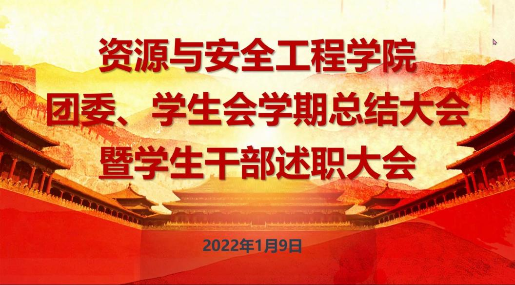 2022年1月9日14:00,资源与安全工程学院学生组织学期总结大会暨学生干部述职大会于线上召开。院分团委书记孙瀚、新媒体中心指导老师肖碧涵以及学生组织全体成员参与本次会议。