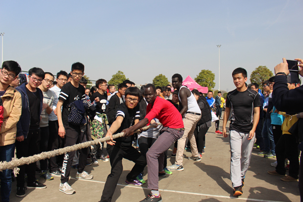 本次比赛共有二十四支队伍,分别为本科生留学生联队、研究生留学生联队、本科16、15、14级各班、研究生16级各班、硕士15级联队等,采用10人次对抗10人次的形式,即每只队伍每一局上场人数为10人次,考虑到实际情况,每局结束后可轮换人员,且要求每队上场比赛的10人中有8名男生,2名女生。比赛中参赛队员双手紧握长绳,团结一心,未参赛的同学自发组成啦啦队为参赛队员高喊加油,活动现场哨子声、呐喊声此起彼伏。本科16级来自南苏丹的留学生们个个人高马大,来自蒙古的研究生联队也是威武雄壮,留学生队伍的多次连胜将整个活动推向了高潮,现场气氛热烈。最终,本科生留学生联队一鼓作气夺得本次拔河比赛的冠军,硕士生留学生联队获得亚军,安全1601班获得季军,其他队伍分别获得了第四至八名、优胜奖、最佳组织奖以及友谊奖。