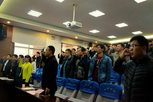 李书记与曹副院长的精彩发言之后,全体成员进行了学术道德宣誓,全体师生均需遵守学术道德,时刻践行自己的诺言。紧接着,学生代表涂鸿渐上台发言,他与在座各位分享了自己心中的科研之道——端正态度、培养兴趣、持之以恒、不断创新。他表示,在学会自我鼓励与欣赏的基础上,应讲究科学研究的方式方法,且要具备一定的“破旧”精神,勇于创新。