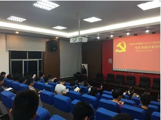 2016年10月20日晚19:00,资安院本科2014级党支部2016下半年党员发展对象答辩会在采矿楼302成功举行,本科2014级党支部书记朱玮老师,正式党员胡文勇、李雪峰同志,以及支部全体预备党员、入党积极分子共计40余人参加了本次答辩会。会议由王黎晔同志主持。