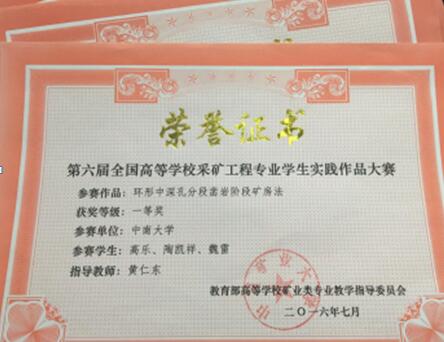 7月22日,第30届全国高校采矿工程专业学术年会暨第六届全国高等学校采矿工程专业学生实践作品大赛在武汉成功举办,我校资源与安全工程学院选送的24件参赛作品中17项作品获奖,包括一等奖3项、二等奖5项、三等奖9项。由本科13级学生杨学鑫、张海军、丁啸天所组团队的参赛作品《钾盐矿地下旱采&淋选一体化开采方案模型》、由13、14级学生赵宇喆、黄煜钊、陈超、戴修山、陈韦宗所组团队的参赛作品《智能型无人凿岩台车物理模型》以及由本科13级学生高乐、陶凯祥、魏雷所组团队的参赛作品《环形中深孔分段凿岩阶段矿房法》获得采矿物理模型类一等奖。本届比赛是资安院获奖项目最多、参与人员最广的一次,取得了历史最好成绩。