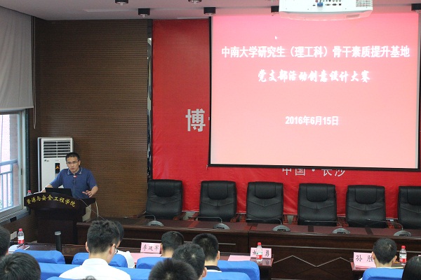 6月15日下午,yl6809永利研究生(理工科)骨干素质提升基地系列活动之党支部活动创意设计大赛在采矿楼302报告厅举行。党委研工部姚勇副部长、粉冶院何桂强副书记、地信院李建军副书记、马克思主义学院杨雪宾副书记以及资安院孙胜副书记受邀担任本次活动的评委。本次活动共有包括资安院、数统院、物电院等在内的14个理工科学院的研究生党支部代表参赛。