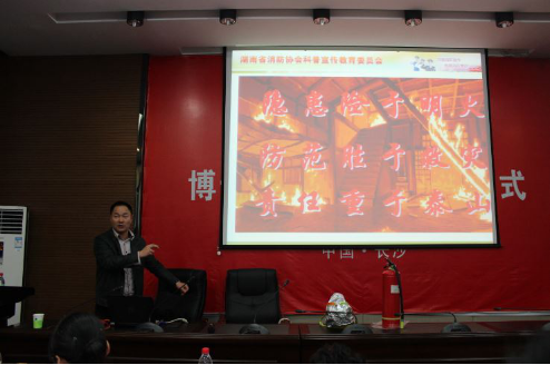 湖南省消防协会科普宣教处教员主任李兵教官在开幕上作了声情并茂的精彩报告,通过相关安全事件的图片和视频让同学深深意识到消防意识的重要性。针对高校的具体情况,李兵教官向同学讲述了高效实验室安全建设的严峻性,在会上重点讲述了实验室安全防火措施,实验室危险物质标志,实验室常见易着火物质等内容,并在现场演示了消防灭火工具的使用方法。