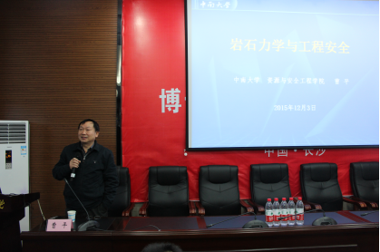 闭幕式由学术报告会和优秀论文颁奖典礼二部分组成。资源与安全工程学院副院长曹平教授应邀作了《岩石力学与工程安全》的学术报告。曹平教授的报告,系统阐述了岩石的强度、岩石的脆性破坏、岩石的大变形破坏、岩石的水作用,与基于工程安全的岩石力学判据间的关系,并表示从事岩石力学实验时,应该慎思笃行,实事求是,严密科学。