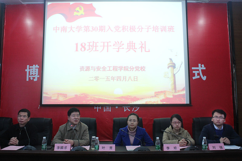 4月8日下午,资源与安全工程学院分党校第30期入党积极分子培训班18班开学典礼在采矿楼302报告厅举行。院党委李顺求书记、院党委孙胜副书记、院业务办主任叶青老师、院学工办副主任李欢老师、13级辅导员兼培训班班导师刘强老师出席典礼,院党委孙胜副书记主持本次开学典礼。