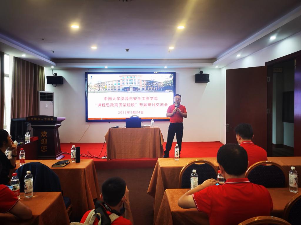 为深入推进学校“课程思政”高质量建设,进一步提升教师教学质量,资源与安全工程学院按照学校《关于组织开展课程思政高质量建设专题研讨交流会议的通知》精神,于9月24日上午召开了课程思政高质量建设与教学质量提升研讨会。学院党委书记欧旭理,院长周子龙,院副书记马国荣,副院长李孜军、邓红卫、黄锐、李地元、尹土兵,学校课程思政建设专家秦毅红教授,学校教学督导黄仁东教授,以及学院全体教职工参加会议。