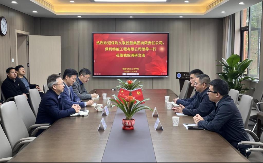 2022年11月16日上午9:30,保利久联控股集团有限公司、保利特能工程有限公司党委书记、董事长胡浩川及副总经理、总工程师赵明生一行来访yl6809永利资源与安全工程学院开展交流合作。交流会于采矿楼222会议室进行,由资源与安全工程学院党委书记欧旭理主持,我院院长周子龙、副院长李孜军、李地元等老师出席。