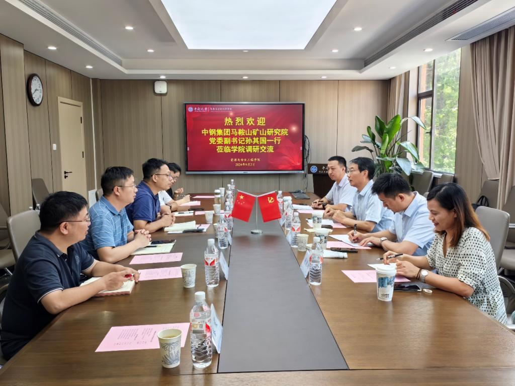 2024年9月2日,中钢集团马鞍山矿山研究院党委副书记、纪委书记孙其国一行来学院开展工作交流。资源与安全工程学院党委书记秦进等学院领导在采矿楼222会议室接待孙其国书记一行,部分教师代表参加交流活动。