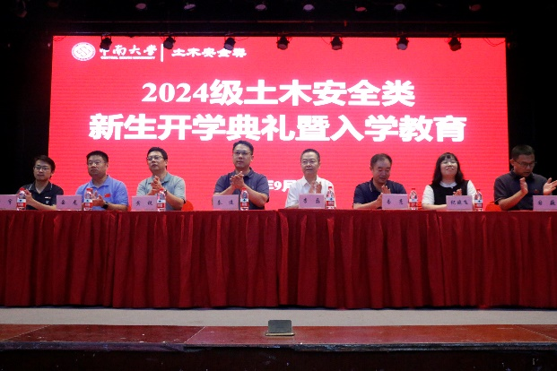 2024年9月12日19点,土木安全类2024级开学典礼暨入学教育于南校区大礼堂隆重举行。资源与安全工程学院党委书记秦进、副书记岳龙、副院长黄锐、学工办主任郑强伟,土木工程学院党委书记李磊、副书记纪晓飞、副院长易亮、国巍出席会议,教师代表、土木安全类辅导员与2024级全体新生参加。会议由土木工程学院学工办主任杨涛主持。